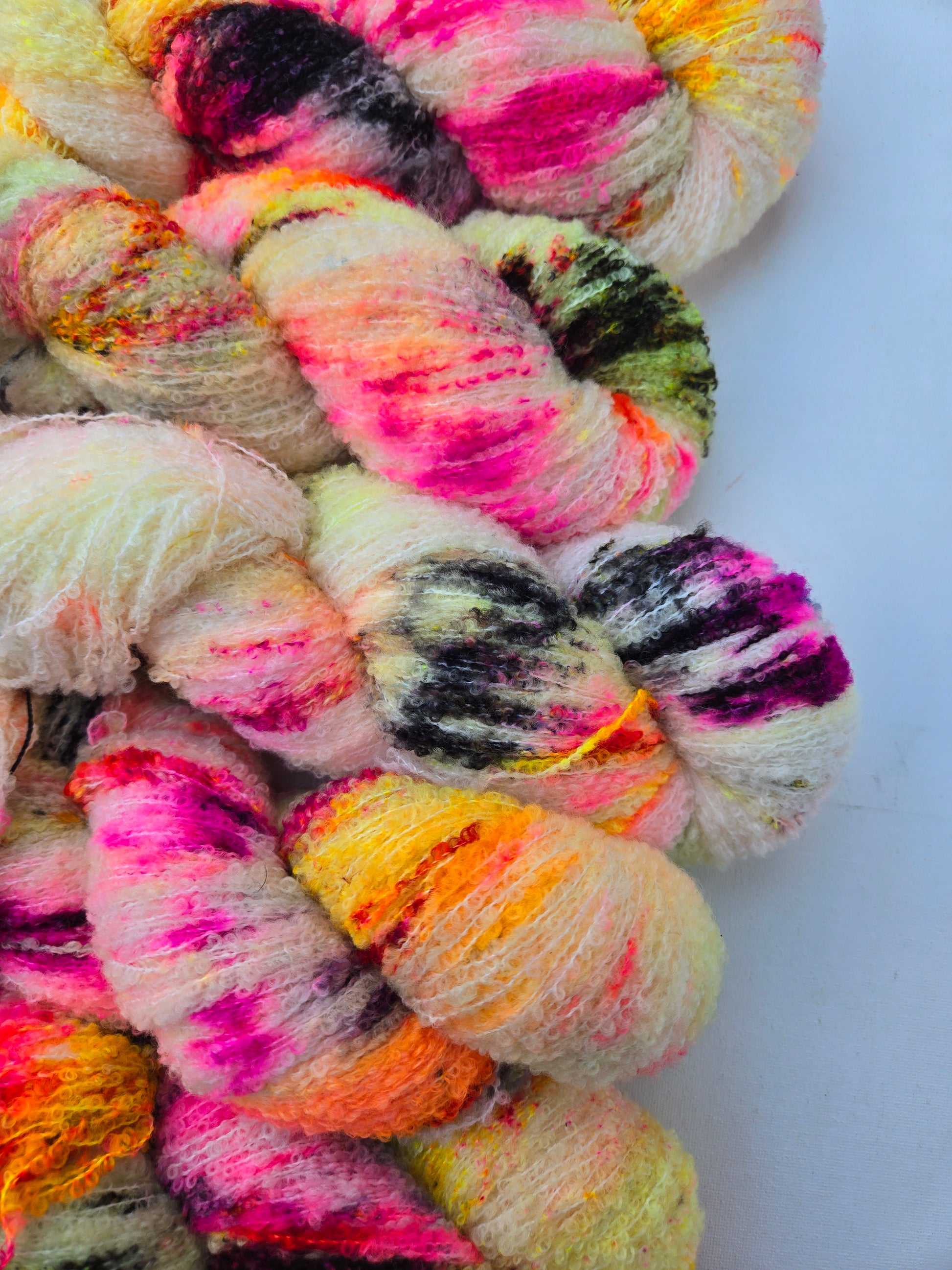Super soft merino wrapped around a nylon core. This yarn is wonderfully versatile and can be used in a wide range of projects. It knits up beautifully on its own on a wide range of needle sizes and can be used as a light DK through to chunky. Combine it with a fingering/sock weight or DK weight yarn to add warmth and texture without weight to sweaters, scarves and cowls.